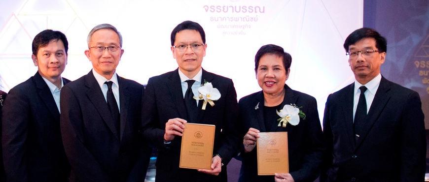 Bangkok Bank Senior Executive Vice President Ruchanee Nopmuang (2nd from right) pictured with Bank of Thailand Governor Veerathai Santiprabhob (center) who honored Bank executives who helped prepare a new code of conduct for the banking industry, namely Executive Vice President in charge of Accounting & Finance Division and Manager of Risk Management Ayuth Krishnamara (right), in charge of Compliance Parnsak Pruksakit (2nd from left) and Manager, Human Resources Division Vetit Assawamangcla (left). The code of conduct aims to provide up-to-date guidelines for the banking industry that meet social expectations and support the sustainable development of the Thai economy based on three principles: 1. Integrity, 2. Fairness and 3. Accountability to Stakeholders. Commercial banks, which are members of the Thai Bankers’ Association, worked together to improve commercial banks’ code of conduct, develop standards to conduct their businesses ethically and help customers be confident that they will receive fair service and accurate product information before making decisions.