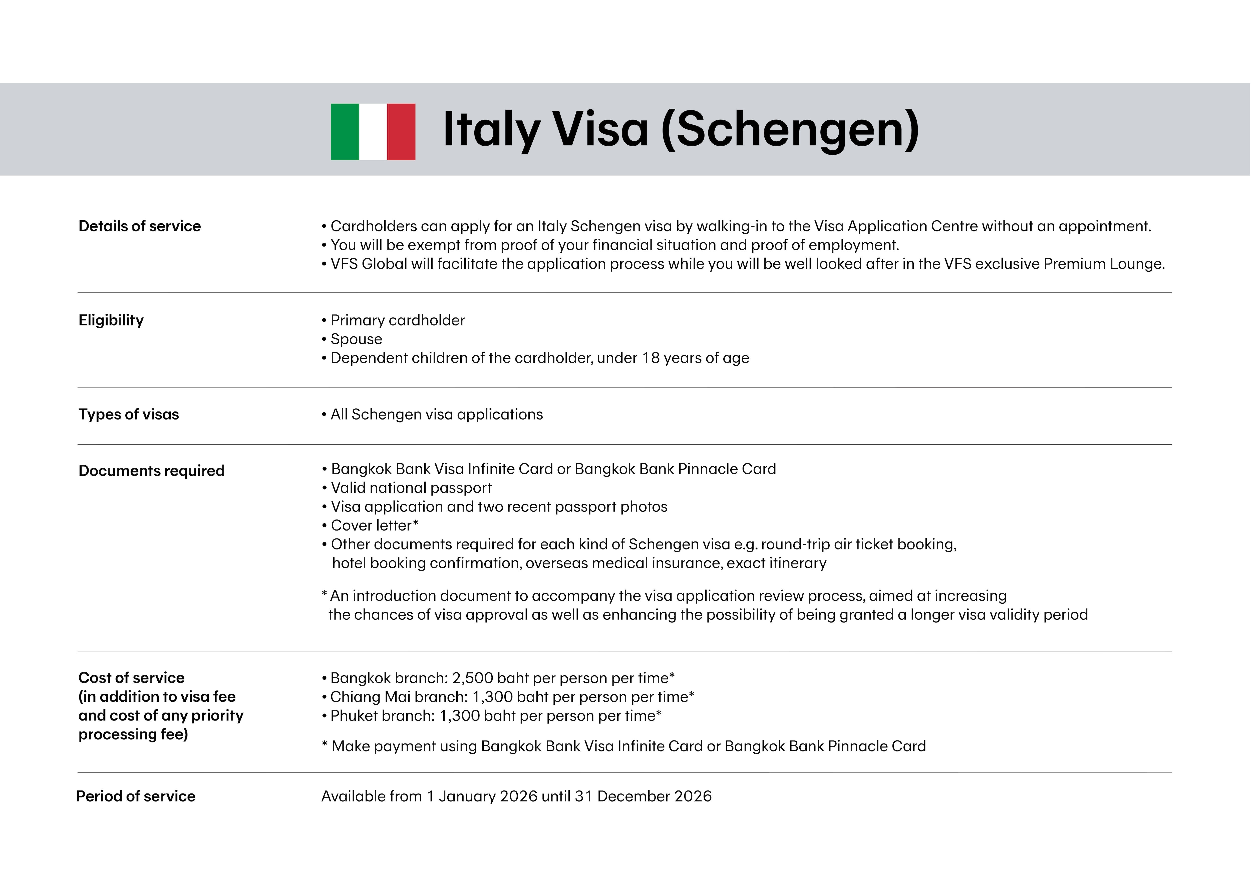 The service offers cardholders who wish to travel to Italy a fast and seamless visa application process; with less pre-planning or need for supporting documents. Simply show passport and Bangkok Bank Pinnacle Card or Bangkok Bank Visa Infinite Card.