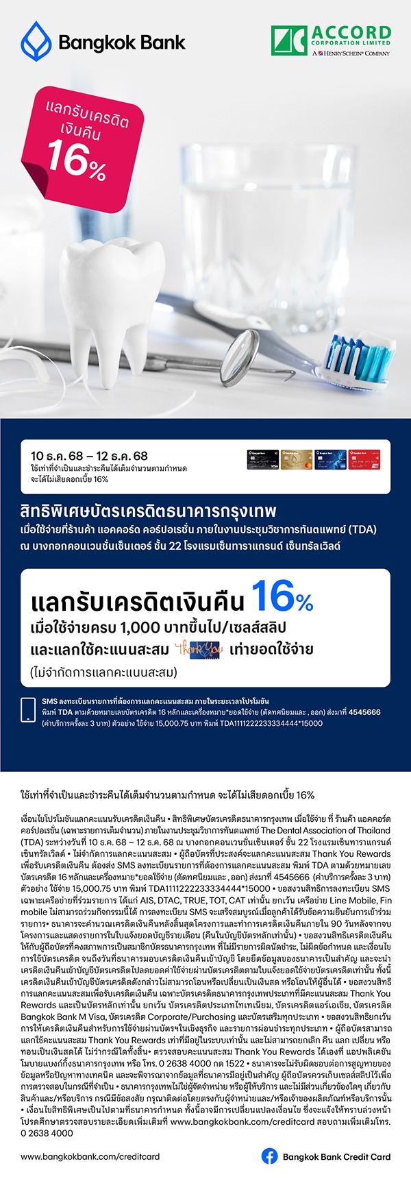 Special privileges for Bangkok Bank credit cardholders when you spend at Accord Corporation at The Dental Association of Thailand Meeting (TDA), the Centara Grand & Bangkok Convention Centre at CentralWorld, Floor 22nd.
