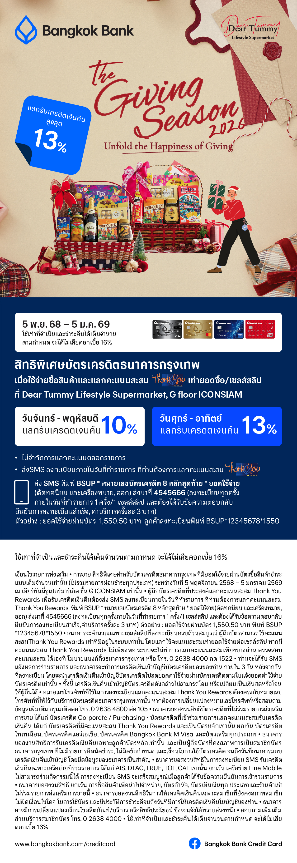 • SMS Register for the privilege 2 (3 baht per SMS) : SMS to 4545666 within the promotion period, Text BSUP * 8-digit card number follow by * and spending amount per sales slip.
