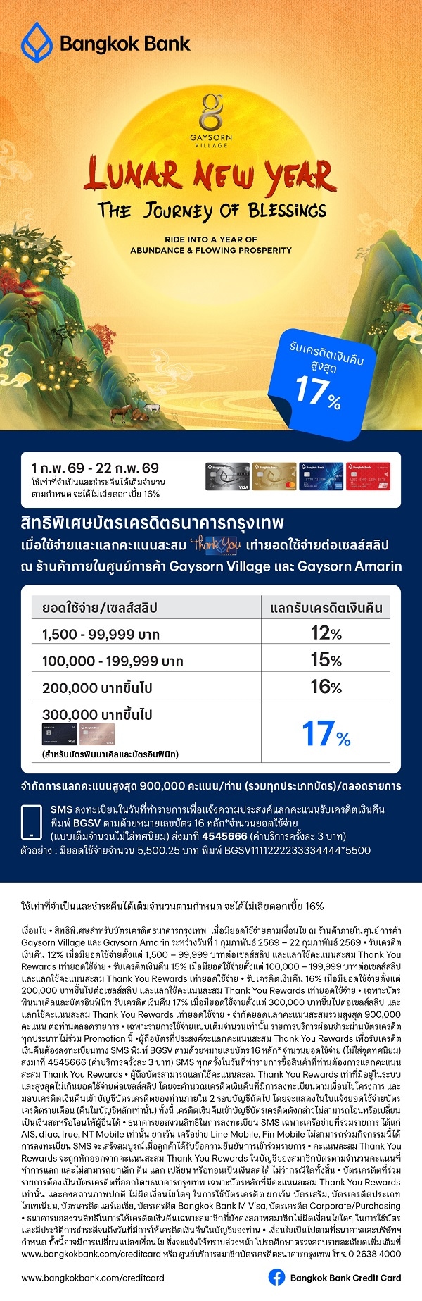 • Tier 1 Spending 1,500 – 99,999 baht/sales slip and redeem Thank You Rewards points equal to the spending amount Get 12% cash back