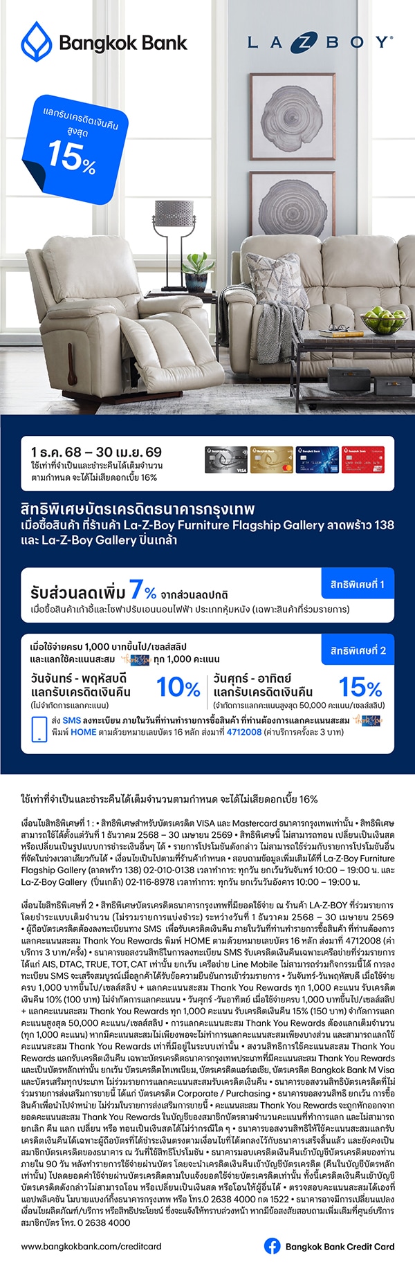 Special privileges for Bangkok Bank credit card for shopping at LA-Z-BOY Furniture Flagship Gallery Ladprao 138 and LA-Z-BOY Gallery Pinklao.
