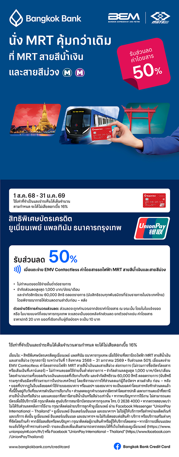 Example of how the discount is calculated: The discount will be calculated from the current fare rate. The amount will be shown on the statement or app of the card issuing bank after deducting the discount. For example, if the normal fare is 20 baht, the amount charged to the cardholder will be 10 baht.
