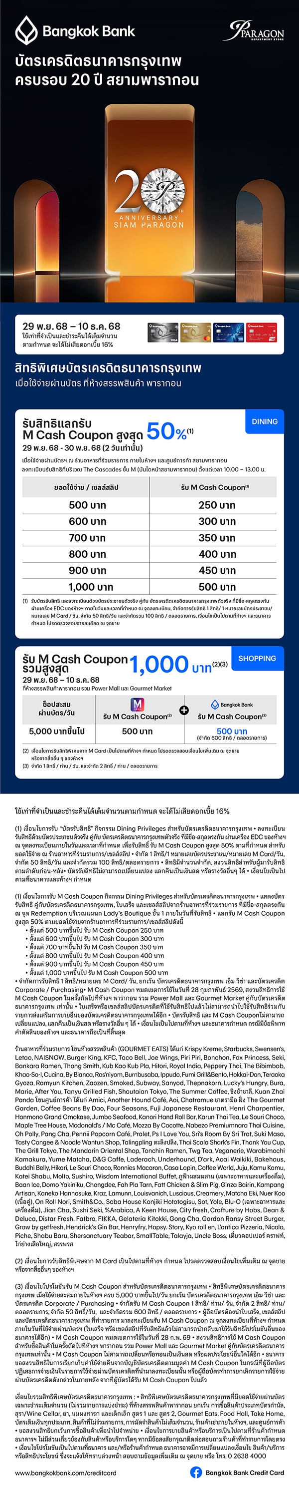 *To redeem, present your privilege queue card and register with your original national ID card together with your original Bangkok Bank credit card (names must match) via the department store’s EDC machine within the specified date and time at the registration point. Limit 1 privilege/national ID number/day, Limit 50 privileges/day, And limit 100 privileges/campaign.