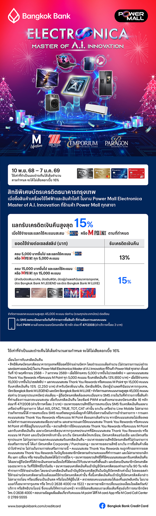 Special privileges for Bangkok Bank credit card shop in Power Mall Electronica Master of A.I. Innovation at Power Mall, all branches.