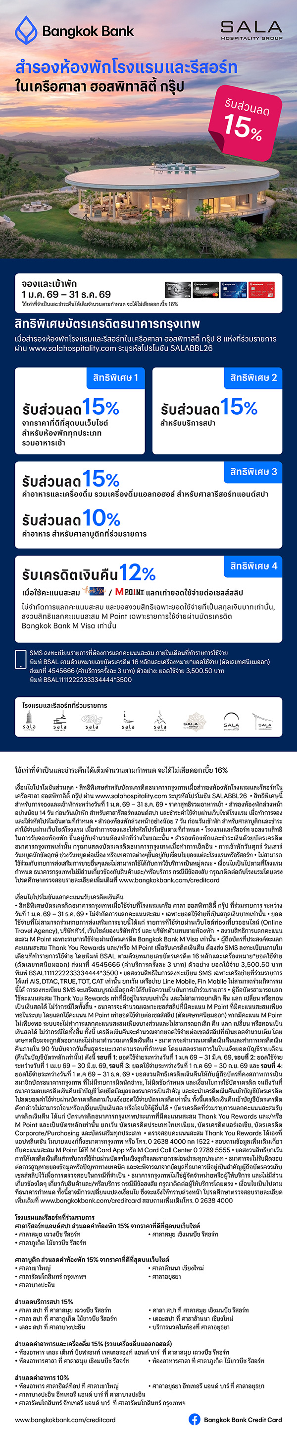Privilege 3 : • Get 15% discount for food and beverage (includes alcoholic beverage) for Sala Resort and Spa.