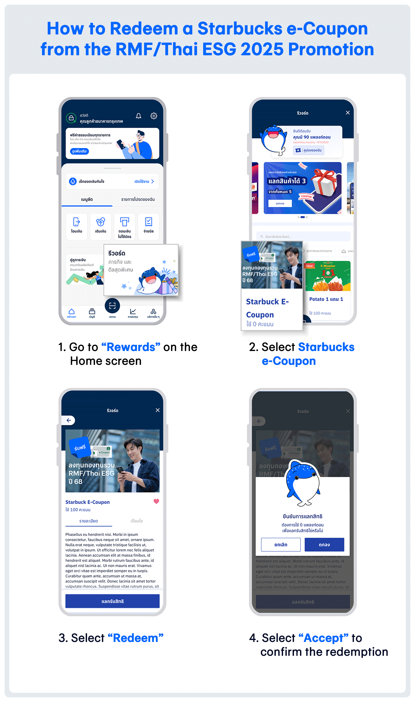 Receive a Starbucks e-Coupon valued up to 1,000 baht per person* when you invest in RMF and/or Thai ESG funds from BBLAM and BCAP from January 2, 2025 – December 30, 2025. You will need to buy investment units at least 5 times via:
