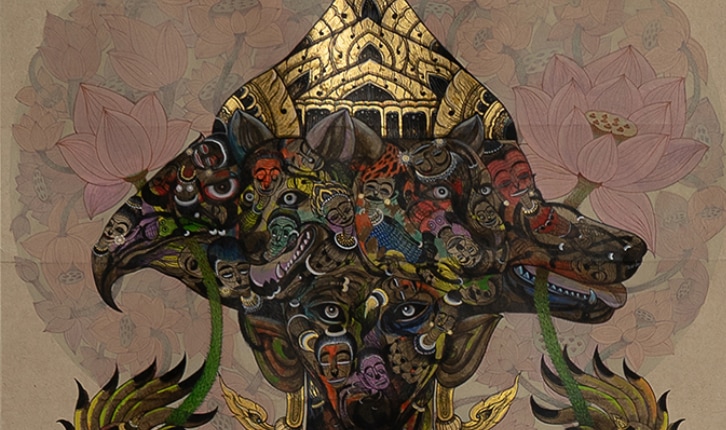 เทคนิค สีฝุ่น สีอะคริลิคบนพื้นกาวมะขามดินสอพองปิดทองคำเปลว ขนาด 200 x 150 ซม.