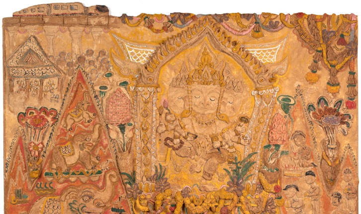 เทคนิค สีฝุ่น สีอะคริลิคบนพื้นกาวมะขามดินสอพองปิดทองคำเปลว ขนาด 200 x 150 ซม.