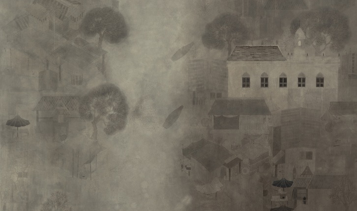 เทคนิค สีฝุ่น และ ผงธูปปั้นบนแผ่นไม้ ขนาด 140 x 200 ซม.