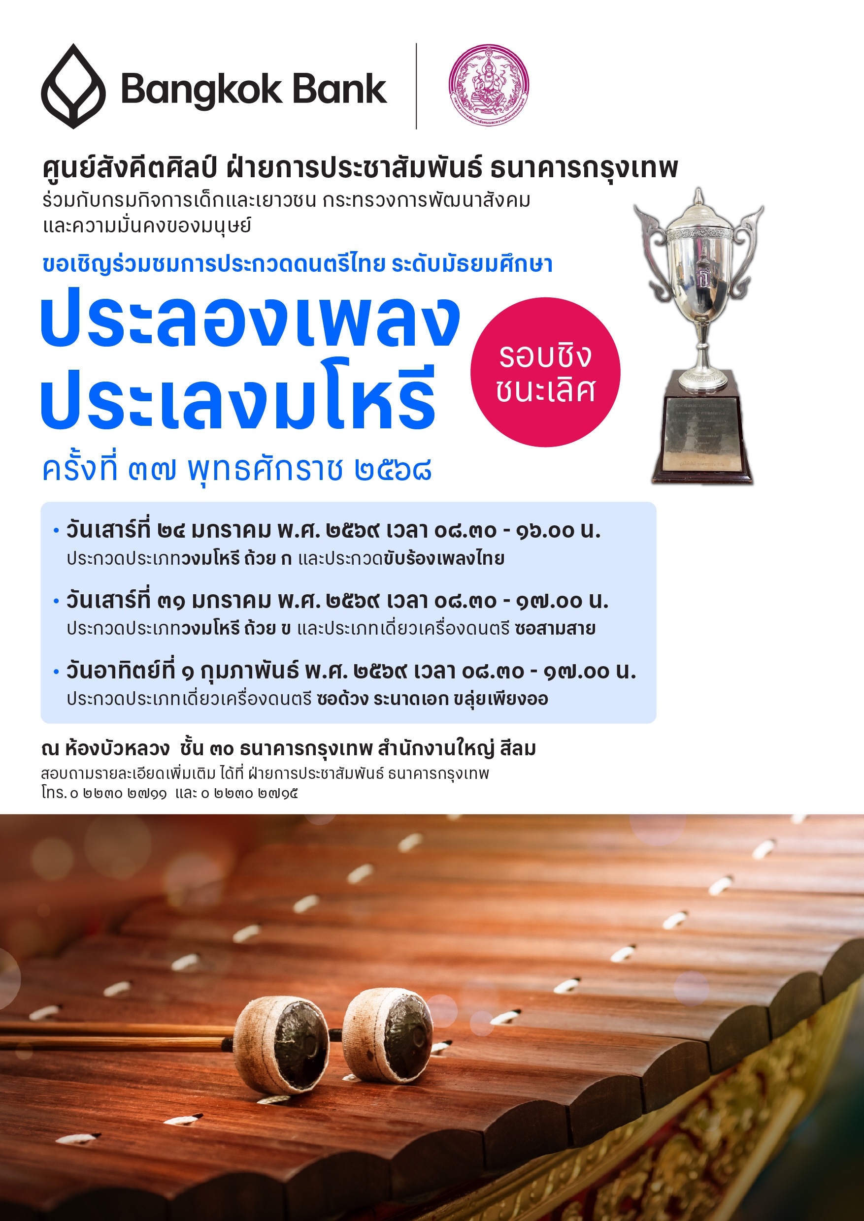 ธนาคารกรุงเทพ จำกัด (มหาชน) ร่วมกับ กรมกิจการเด็กและเยาวชน กระทรวงการพัฒนาสังคมและความมั่นคงของมนุษย์ จึงได้ดำเนินการให้มีการประกวดดนตรีไทย ระดับมัธยมศึกษา “ประลองเพลง ประเลงมโหรี” มาอย่างต่อเนื่องตั้งแต่ปีพุทธศักราช 2529 จนถึงปัจจุบัน เป็นระยะเวลากว่า 39 ปี