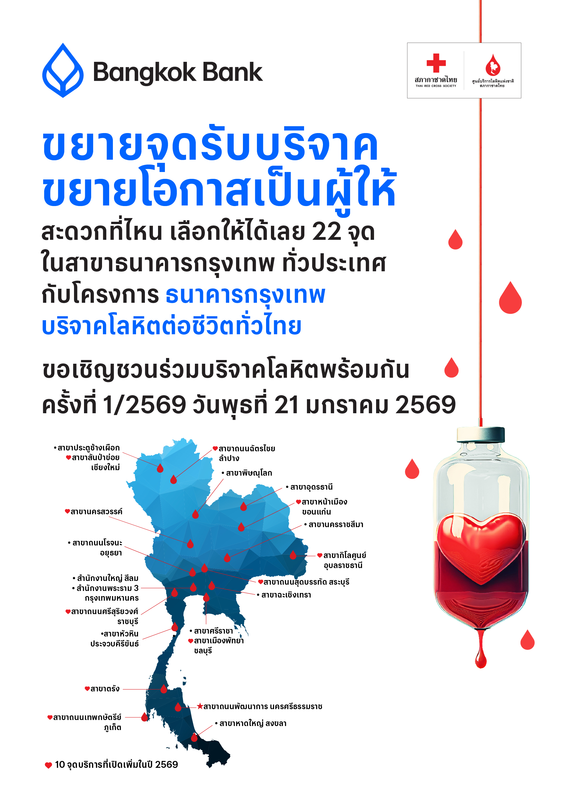 ธนาคารกรุงเทพขยายจุดรับบริจาคโลหิตเคลื่อนที่เพิ่มอีก 10 จุด รวมเป็น 22 จุด ครอบคลุมสาขาทุกภูมิภาคทั่วประเทศ ในโครงการ “ธนาคารกรุงเทพ บริจาคโลหิตต่อชีวิตทั่วไทย” เริ่มบริจาคโลหิตครั้งที่ 1/2569 ในวันพุธที่ 21 มกราคม 2569