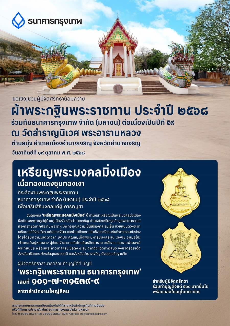 โอกาสนี้ ขอเชิญชวนผู้มีจิตศรัทธาร่วมทำบุญน้อมถวาย ‘ผ้าพระกฐินพระราชทาน’ ประจำปี 2568 ร่วมทำบุญตั้งแต่ 500 บาทขึ้นไป รับ ‘เหรียญพระมงคลมิ่งเมือง’ เนื้อทองแดงชุบทองเงา ที่ระลึกงานพระกฐินพระราชทาน ธนาคารกรุงเทพ จำกัด (มหาชน) ประจำปี 2568