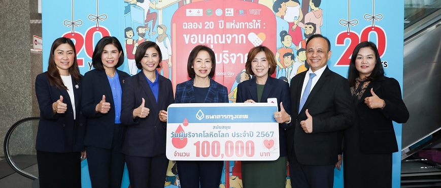เพื่อนคู่คิดขอบคุณผู้ให้ - นางสาวพจณี คงคาลัย ผู้ช่วยผู้จัดการใหญ่ สายลูกค้าบุคคล (ที่ 4 จากซ้าย) นายสุวิทย์ อินทรเฉลิม เจ้าหน้าที่บริหารระดับ Vice President ฝ่ายการประชาสัมพันธ์ (ที่ 2 จากขวา) นางสาวทรรศวรรณ จันทร์สาย เจ้าหน้าที่บริหารระดับ Vice President ผู้จัดการภาคนครหลวง 1 (ที่ 3 จากซ้าย) นางสาวสุนันฐินี แสนคำ เจ้าหน้าที่บริหารระดับ Assistant Vice President ผู้จัดการสาขาสุรวงศ์ (ที่ 2 จากซ้าย) และนางสาวประภาพร กีรติบัวคำ เจ้าหน้าที่บริหารระดับ Assistant Vice President ผู้จัดการสาขาอาคารอับดุลราฮิม (ซ้ายสุด) ธนาคารกรุงเทพ จำกัด (มหาชน) ในฐานะ ‘เพื่อนคู่คิด มิตรคู่บ้าน’ มอบเงินสนับสนุนการจัดกิจกรรม "วันผู้บริจาคโลหิตโลก" จำนวน 100,000 บาท ต่อเนื่องเป็นปีที่ 13 ให้แก่ศูนย์บริการโลหิตแห่งชาติ สภากาชาดไทย โดยมี นางสาวปิยนันท์ คุ้มครอง ผู้ช่วยผู้อำนวยการ ด้านจัดหาโลหิตและภาพลักษณ์องค์กร (ที่ 3 จากขวา) เป็นผู้รับมอบ เพื่อร่วมสนับสนุนการจัดทำเสื้อยืดที่ระลึก มอบให้ผู้ที่มาร่วมบริจาคโลหิต โอกาสฉลองครบรอบ 20 ปี ‘วันผู้บริจาคโลหิตโลก’ ในปี 2567 นี้ ซึ่งสภากาชาดจัดกิจกรรมขึ้นภายใต้แนวคิด “20 ปี แห่งการให้ ขอบคุณจากใจถึงผู้บริจาคโลหิต” (20 years of celebrating giving: Thank you, blood donors! 14 June 2024) โอกาสเดียวกันนี้ คณะผู้บริหาร และพนักงาน “บัวหลวงจิตอาสา” ของธนาคาร ร่วมงานแจกเสื้อที่ระลึกแก่ ‘ผู้ให้’ พร้อมอำนวยความสะดวก และแนะนำขั้นตอนในการรับบริจาคโลหิตให้แก่ประชาชน ณ ศูนย์บริการโลหิตแห่งชาติ สภากาชาดไทย ถนนอังรีดูนังต์ กรุงเทพฯ