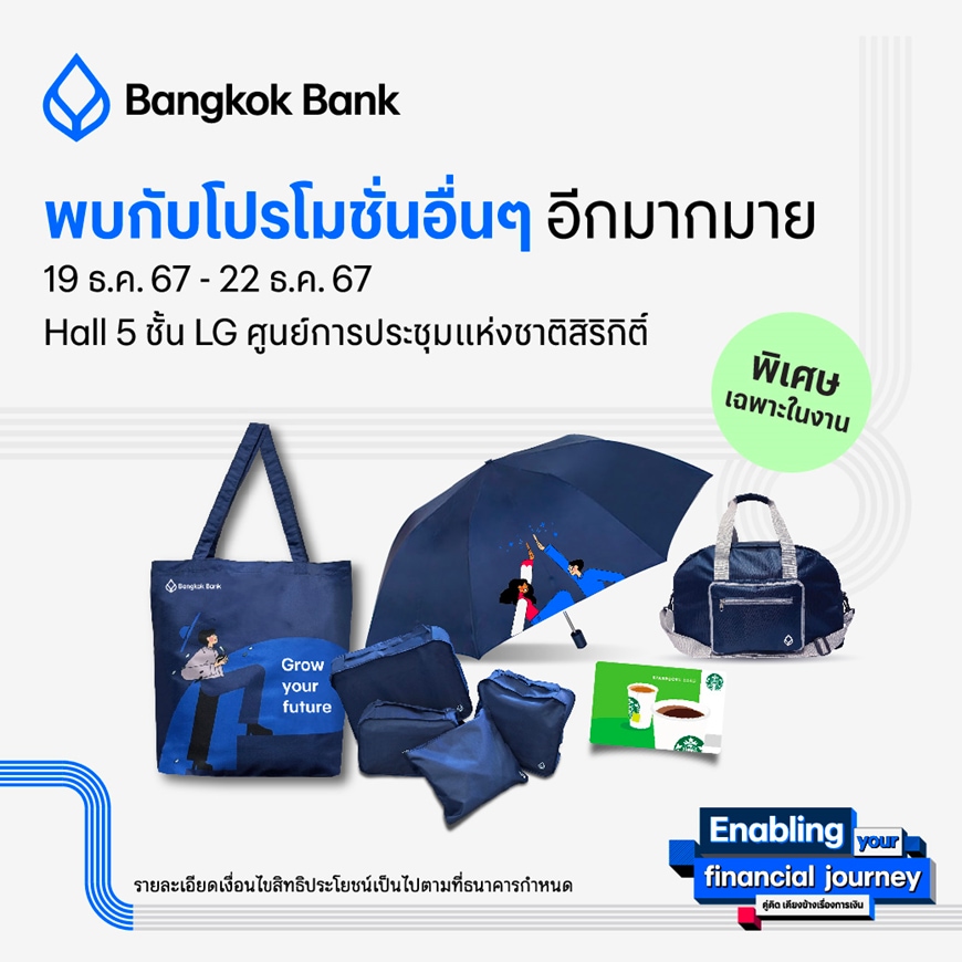 สำหรับลูกค้าที่ซื้อผลิตภัณฑ์และบริการทางการเงินที่บูธธนาคารกรุงเทพ รับโปรโมชันและของที่ระลึกพิเศษ อาทิ