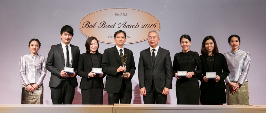 นายสอาด ธีรโรจนวงศ์ ผู้ช่วยผู้จัดการใหญ่ (ที่ 4 จากซ้าย) พร้อมคณะผู้บริหารและเจ้าหน้าที่ สายบริหารการเงิน ธนาคารกรุงเทพ จำกัด (มหาชน) รับมอบรางวัลจากนายรพี สุจริตกุล เลขาธิการ สำนักงานคณะกรรมการกำกับหลักทรัพย์และตลาดหลักทรัพย์ (ที่ 4 จากขวา) ในงานประกาศรางวัล ‘ตราสารหนี้ยอดเยี่ยมแห่งปี 2559’ (ThaiBMA Best Bond Awards 2016) ของสมาคมตลาดตราสารหนี้ไทย (The Thai Bond Market Association) โดยในปีนี้ธนาคารกรุงเทพได้รับประกาศความยอดเยี่ยมถึง 3 รางวัล เป็นรางวัลจากกระทรวงการคลัง (MOF Awards) 2 รางวัล ได้แก่ Best Primary Market Contributor รางวัลสถาบันการเงินที่ได้รับการจัดสรรพันธบัตรรัฐบาลในตลาดแรกสูงสุด และ Best Secondary Market Contributor รางวัลสถาบันการเงินที่มีสัดส่วนมูลค่าธุรกรรมซื้อขายพันธบัตรรัฐบาลในตลาดรองสูงสุด และเป็นรางวัลจากสมาคมตลาดตราสารหนี้ไทย (ThaiBMA Awards) 1 รางวัล ได้แก่ Best Bond Dealer รางวัลสถาบันการเงินผู้ค้าตราสารหนี้ที่มีความโดดเด่นในการทำธุรกรรมในตลาดรองทั้งในตลาดตราสารหนี้ภาครัฐและภาคเอกชน นับเป็นการตอกย้ำความสำเร็จของธนาคารและทีมการทำงานที่มีความโดดเด่นในด้านธุรกรรมตราสารหนี้ที่สามารถส่งเสริมพัฒนาการของตลาดตราสารหนี้ให้เติบโตอย่างยั่งยืน