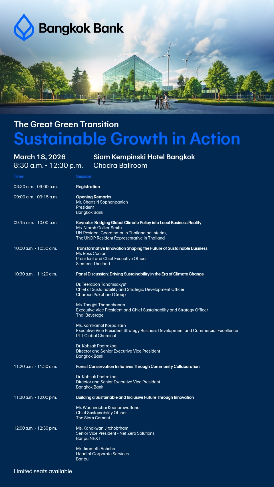 ธนาคารกรุงเทพสนับสนุนภาคธุรกิจเปลี่ยนผ่านสู่เศรษฐกิจคาร์บอนต่ำ ในงานเสวนา “The Great Green Transition: Sustainable Growth in Action” ร่วมอัพเดตเทรนด์ นโยบาย กฎระเบียบและข้อบังคับด้านการเปลี่ยนแปลงสภาพภูมิอากาศในบริบทโลกและบริบทของประเทศไทย รวมถึงเจาะลึกแนวทางในการปรับตัวของธุรกิจให้สอดคล้องกับเป้าหมายการลดก๊าซเรือนกระจก ผ่านการแลกเปลี่ยนมุมมองของผู้นำที่มีความเชี่ยวชาญและประสบความสำเร็จในการเปลี่ยนผ่านองค์กร