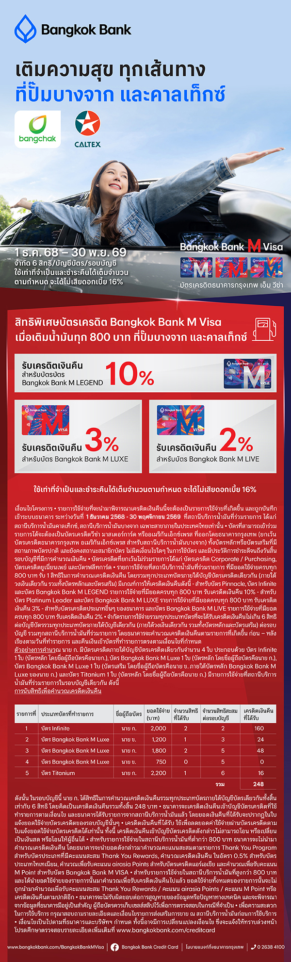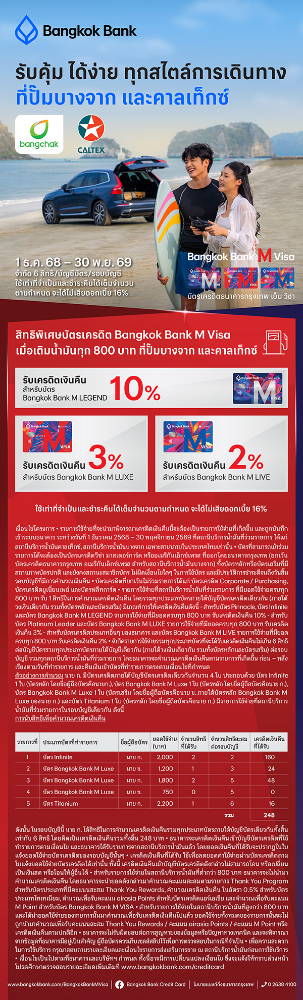 เมื่อเติมน้ำมันครบทุก 800 บาท ผ่านบัตรเครดิตธนาคารกรุงเทพ เอ็ม วีซ่า ที่ปั๊มบางจาก และคาลเท็กซ์ รับเครดิตเงินคืนสูงสุด 10% ดังนี้