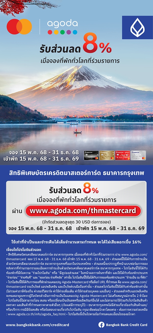 • รับส่วนลด 8% เมื่อจองที่พักทั่วโลกที่ร่วมรายการ ผ่าน www.agoda.com/thmastercard
