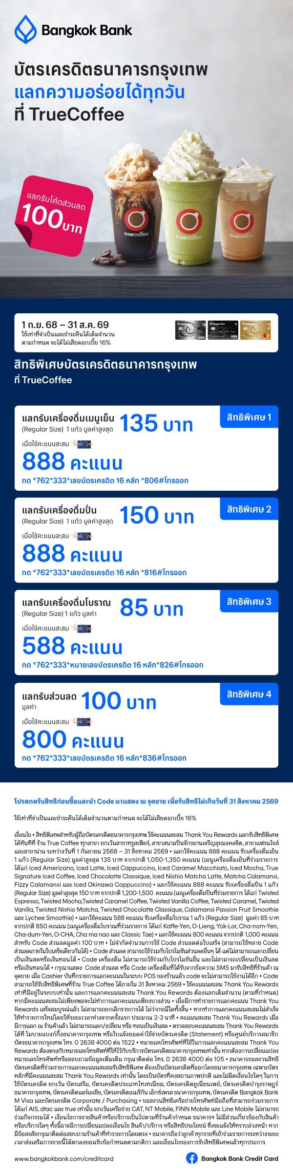 • แลกใช้คะแนน 888 คะแนน รับเครื่องดื่มปั่น 1 แก้ว (Regular Size) มูลค่าสูงสุด 150 บาท  (เมนูเครื่องดื่มปั่นที่ร่วมรายการ - Twisted Espresso, Twisted Mocha,Twisted Caramel Coffee, Twisted Vanilla Coffee, Twisted Caramel, Twisted Vanilla, Twisted Nishio Matcha, Twisted Chocolatte Classique, Calamansi Passion Fruit Smoothie และ Lychee Smoothie)