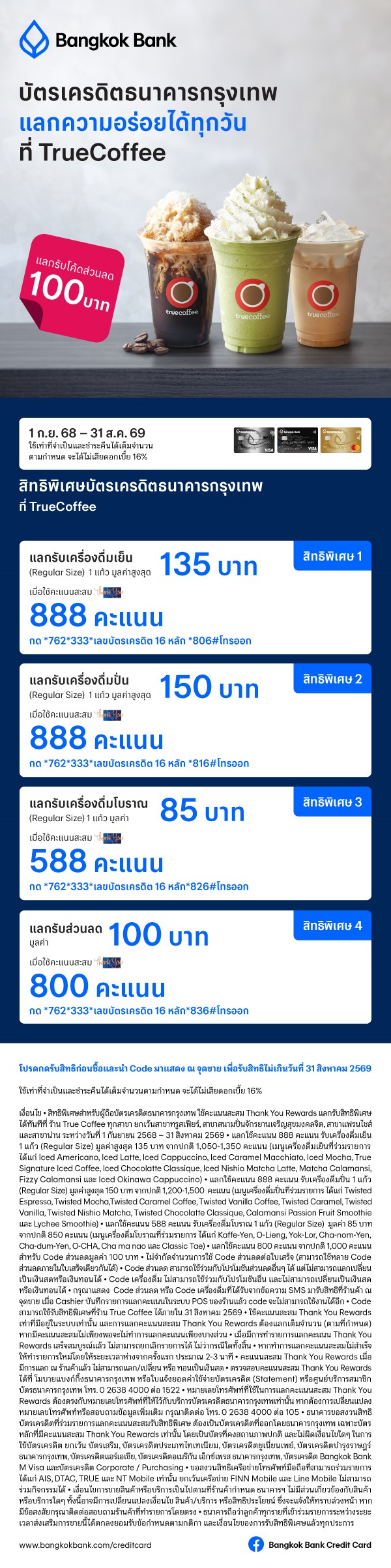 •  แลกใช้คะแนน 888 คะแนน รับเครื่องดื่มเย็น 1 แก้ว (Regular Size) มูลค่าสูงสุด 135 บาท  (เมนูเครื่องดื่มเย็นที่ร่วมรายการ - Iced Americano, Iced Latte, Iced Cappuccino, Iced Caramel Macchiato, Iced Mocha, True Signature Iced Coffee, Iced Chocolatte Classique, Iced Nishio Matcha Latte, Matcha Calamansi, Fizzy Calamansi และ Iced Okinawa Cappuccino)