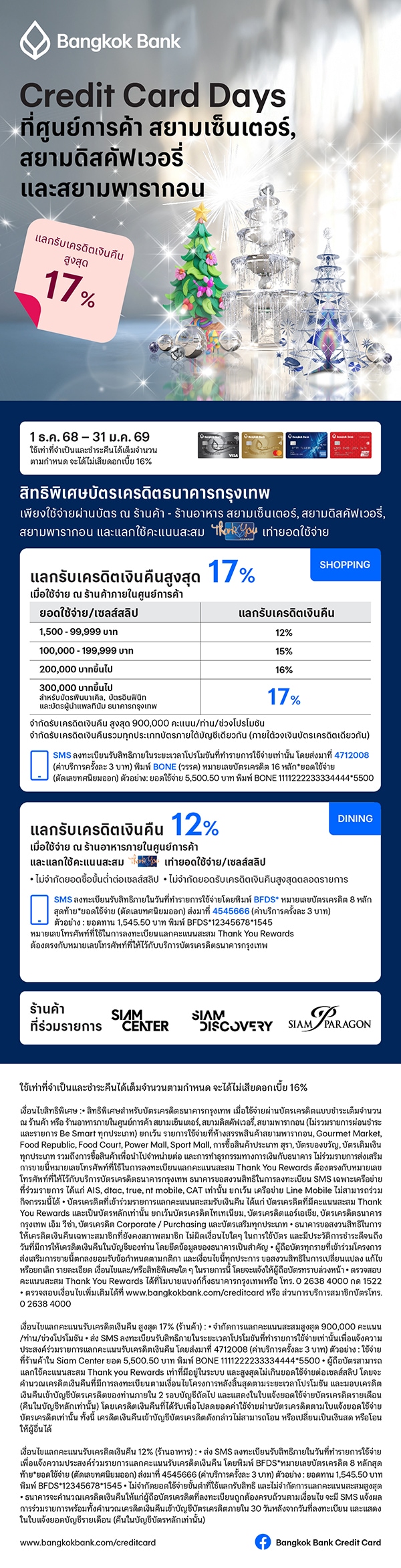 Privilege 1 : เมื่อใช้คะแนนสะสม Thank You Rewards แลกเท่ายอดใช้จ่ายต่อเซลส์สลิป รับเครดิตเงินคืนสูงสุด 17%