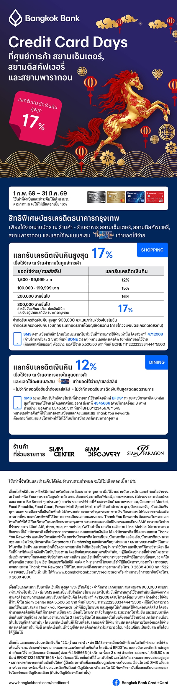 Privilege 1 : เมื่อใช้คะแนนสะสม Thank You Rewards แลกเท่ายอดใช้จ่ายต่อเซลส์สลิป รับเครดิตเงินคืนสูงสุด 17%