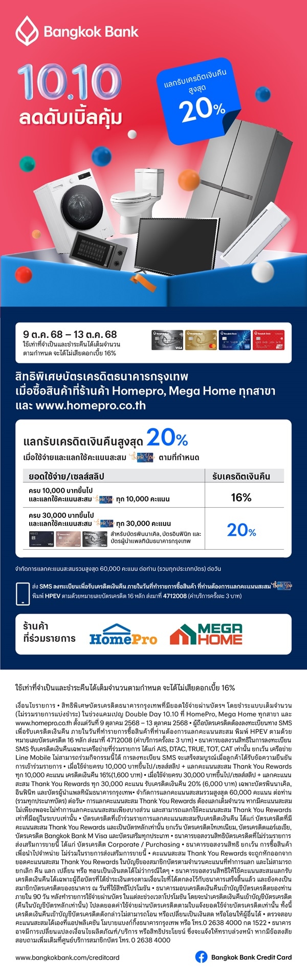 •  แลกรับเครดิตเงินคืน 20% สำหรับบัตรพินนาเคิล, บัตรอินฟินิท และบัตรผู้นำแพลทินัมธนาคารกรุงเทพ เมื่อใช้จ่ายผ่านบัตรฯ ตั้งแต่ 30,000 บาทขึ้นไปต่อเซลส์สลิป และแลกใช้คะแนนสะสม Thank You Rewards ทุก 30,000 คะแนน