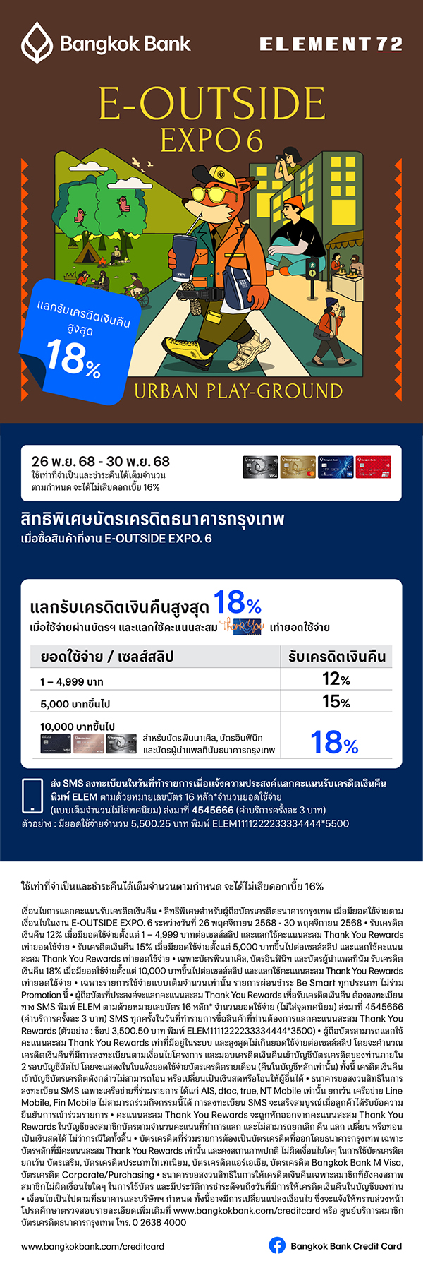 • Tier 2 ยอดใช้จ่าย 5,000 บาทขึ้นไป/เซลส์สลิป และแลกใช้คะแนนสะสม Thank You Rewards เท่ายอดใช้จ่าย รับเครดิตเงินคืน 15%