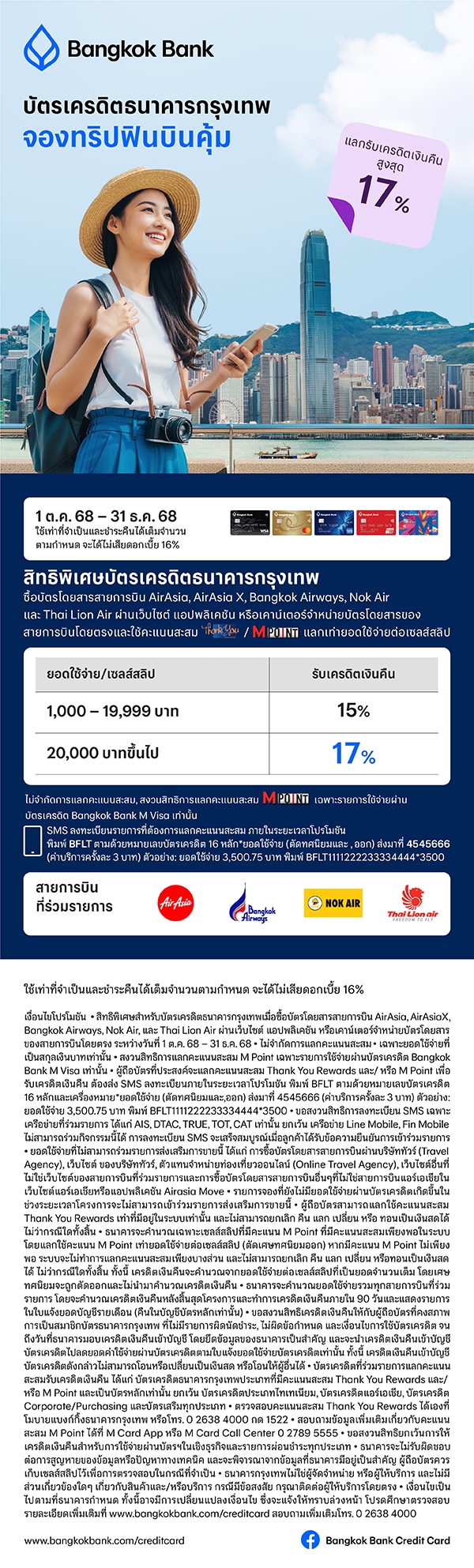 ซื้อบัตรโดยสารสายการบิน AirAsia, AirAsia X, Bangkok Airways, Nok Air และ Thai Lion Air ผ่าน เว็บไซต์, แอปพลิเคชัน หรือเคาน์เตอร์จำหน่ายบัตรโดยสารของสายการบินโดยตรง และใช้คะแนนสะสม Thank You Rewards/M Point แลกเท่ายอดใช้จ่ายต่อเซลส์สลิป