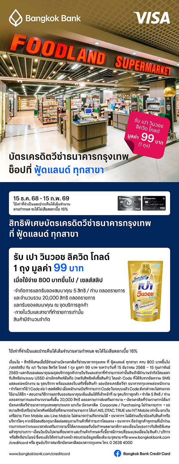 สิทธิพิเศษสำหรับบัตรเครดิตวีซ่า ธนาคารกรุงเทพ เมื่อช็อปที่ ฟู้ดแลนด์ ซูเปอร์มาร์เก็ต ทุกสาขา