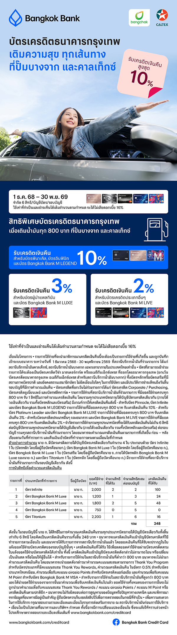 เมื่อเติมน้ำมันครบทุก 800 บาท ผ่านบัตรเครดิตธนาคารกรุงเทพ ที่ปั๊มบางจาก และคาลเท็กซ์ รับเครดิตเงินคืนสูงสุด 10%