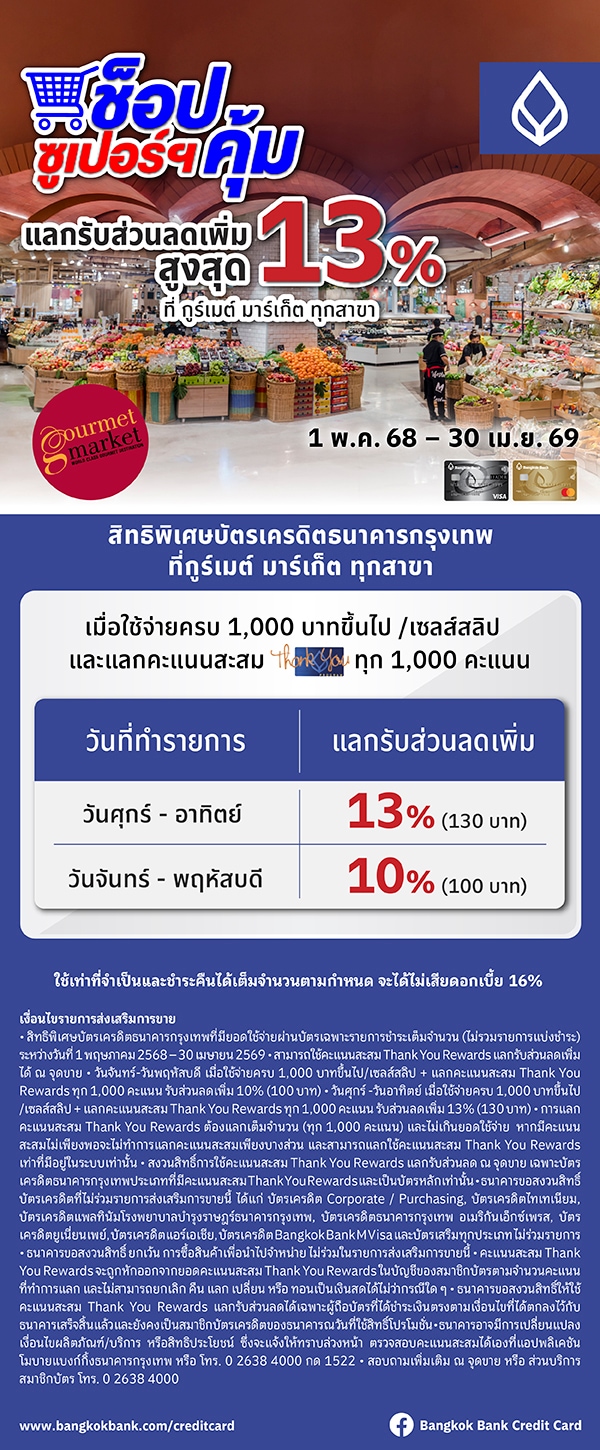 แลกคะแนนสะสม Thank You Rewards รับส่วนลดเพิ่มสูงสุด 13% ที่ร้าน กูร์เมต์ มาร์เก็ต หรือโฮม เฟรช มาร์ท ทุกสาขา
