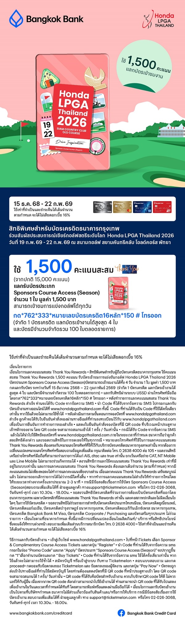 แลกรับบัตร Sponsors Course Access (Season) จำนวน 1 ใบ มูลค่า 1,500 บาท สามารถเข้าชมการแข่งกอล์ฟได้ทั้ง 4 วัน ( 19 - 22 ก.พ.69)
