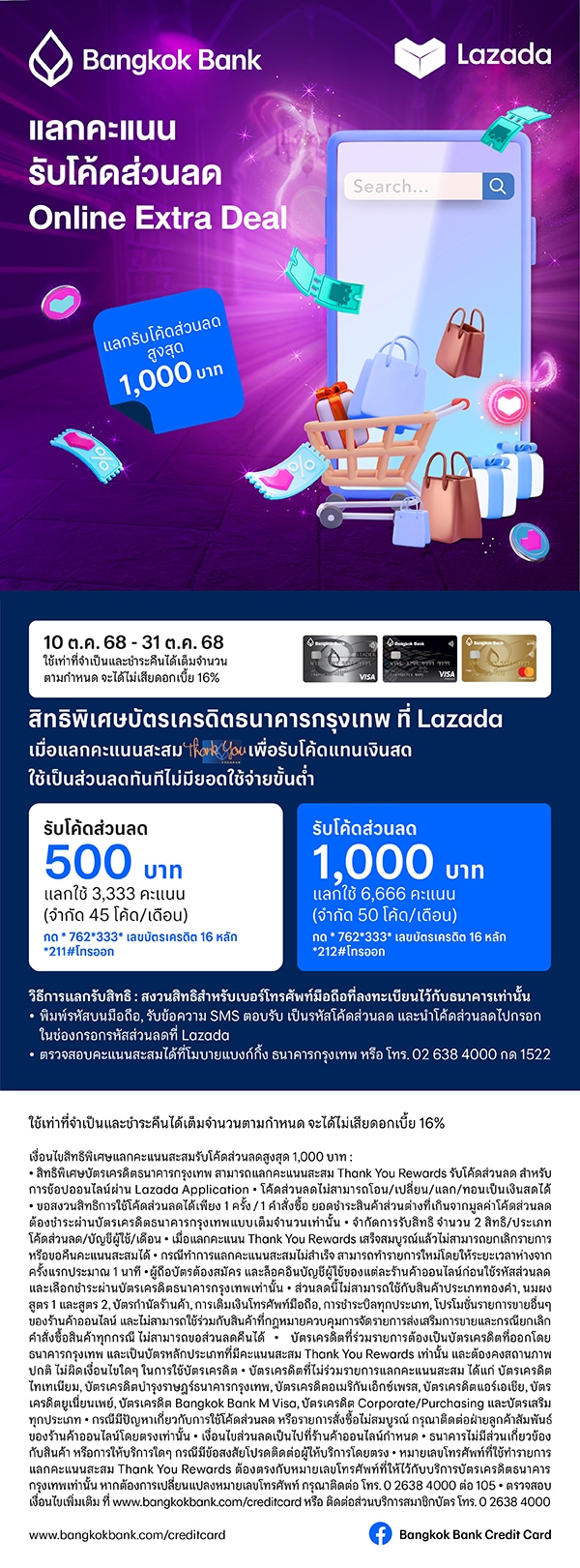 บัตรเครดิตธนาคารกรุงเทพ แลกใช้คะแนนสะสม Thank You Rewards รับโค้ดส่วนลดใช้เป็นส่วนลดทันที ไม่มียอดใช้จ่ายขั้นต่ำที่ Lazada