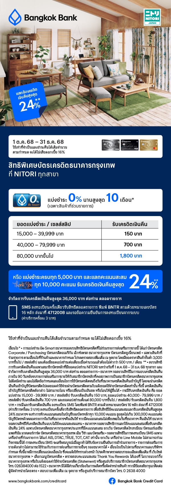 สิทธิพิเศษสำหรับผู้ถือบัตรเครดิตธนาคารกรุงเทพ เมื่อช็อปที่ NITORI แบ่งชำระ 0% นานสูงสุด 10 เดือน แลกรับเครดิตเงินคืนสูงสุด 24%