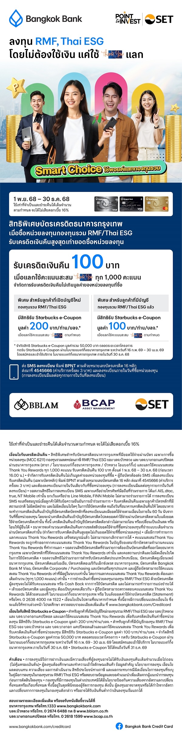 • รับเครดิตเงินคืนสูงสุดเท่ายอดซื้อหน่วยลงทุน เมื่อซื้อหน่วยลงทุนกองทุน RMF/Thai ESG  และแลกใช้คะแนนสะสม Thank You Rewards ทุก 1,000 คะแนน รับเครดิตเงินคืน 100 บาท