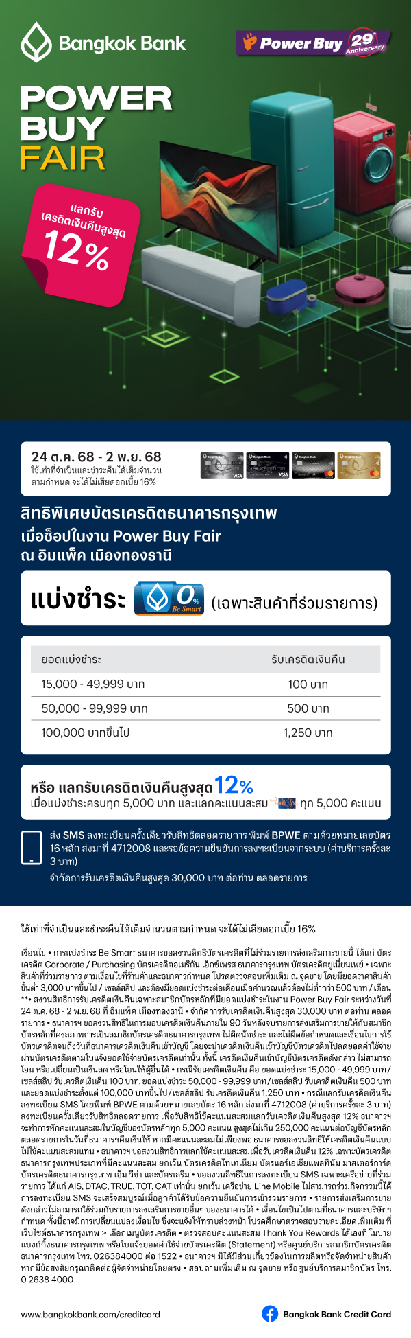สิทธิพิเศษสำหรับผู้ถือบัตรเครดิตธนาคารกรุงเทพ เมื่อแบ่งชำระ 0% นานสูงสุด 10 เดือน แลกรับเครดิตเงินคืนสูงสุด 12% ที่งาน Power Buy Fair