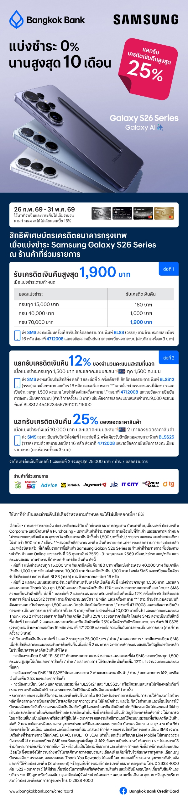 สิทธิพิเศษสำหรับผู้ถือบัตรเครดิตธนาคารกรุงเทพเมื่อซื้อ Samsung Galaxy S26 Series ณ ร้านค้าที่ร่วมรายการ รับข้อเสนอพิเศษกับโปรแกรมแบ่งชำระ 0% นานสูงสุด 10 เดือน พร้อมรับเงินคืนสูงสุด 25%