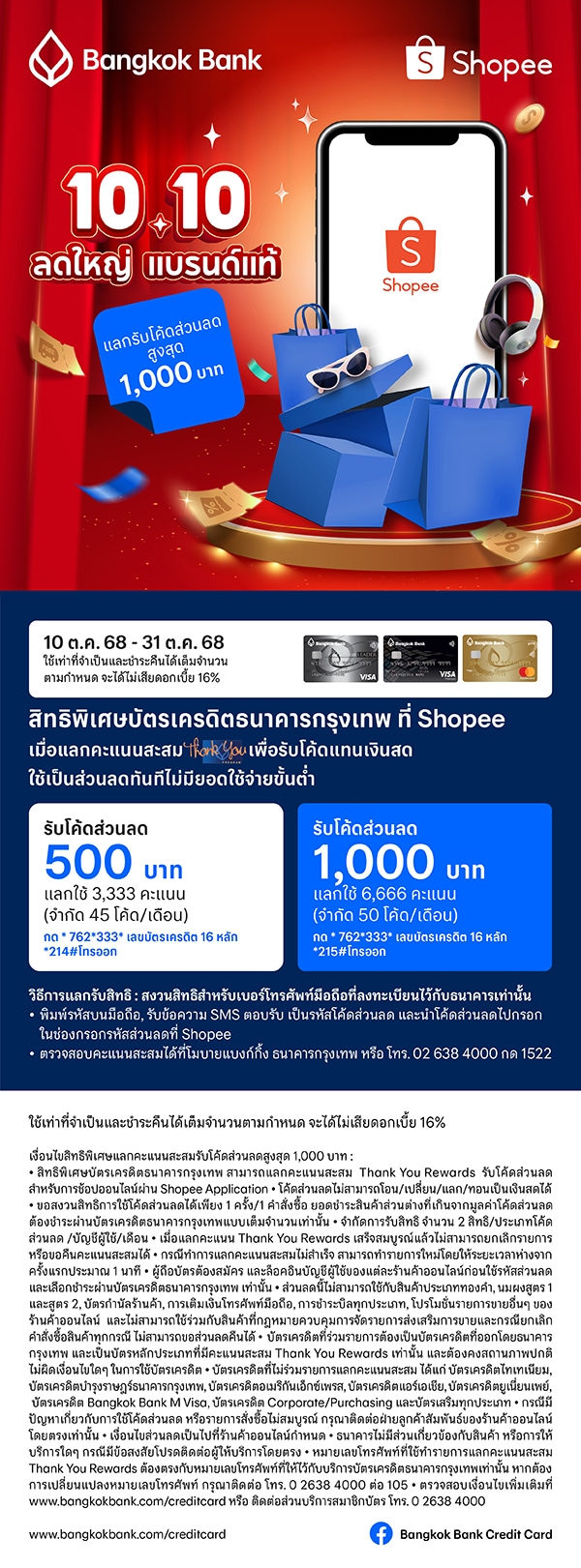 บัตรเครดิตธนาคารกรุงเทพ แลกใช้คะแนนสะสม Thank You Rewards รับโค้ดส่วนลดใช้เป็นส่วนลดทันที ไม่มียอดใช้จ่ายขั้นต่ำที่ Shopee