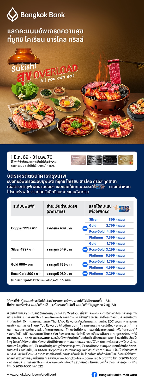 บัตรเครดิตธนาคารกรุงเทพ ชำระค่าบุฟเฟต์ผ่านบัตรเครดิตธนาคารกรุงเทพ และแลกใช้คะแนนสะสม Thank You Rewards ตามที่กำหนด รับสิทธิแลกอัพเกรดบุฟเฟต์ที่ร้านอาหารซูกิชิ โคเรียน ชาร์โคล กริลล์ ทุกสาขา