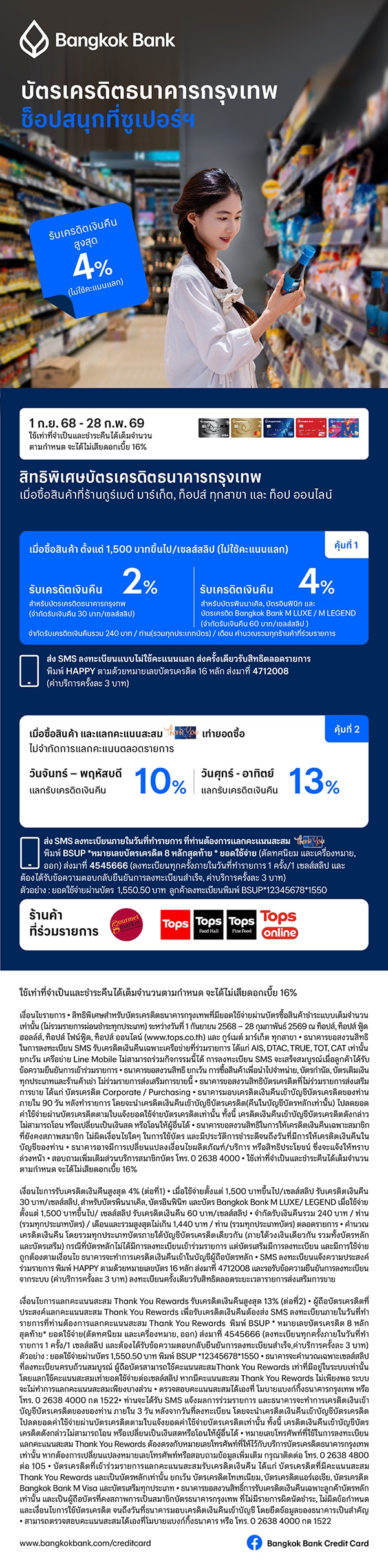 • จำกัดรับเครดิตเงินคืนรวมสูงสุด 240 บาท/ท่าน (รวมทุกประเภทบัตร)/เดือน คำนวณรวมทุกร้านค้า