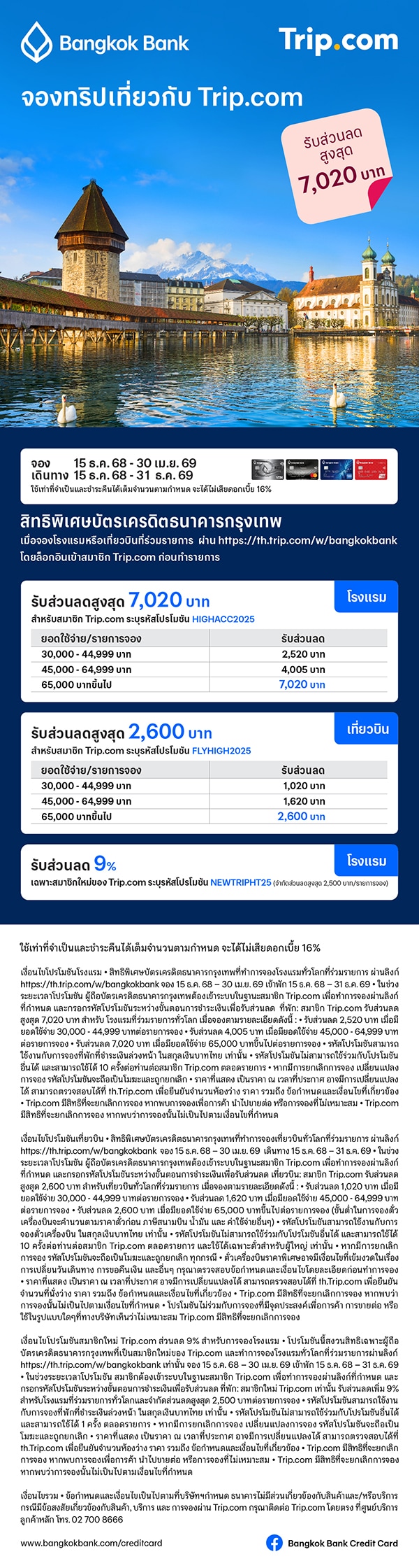 สิทธิพิเศษบัตรเครดิตธนาคารกรุงเทพ เมื่อจองโรงแรมหรือเที่ยวบินที่ร่วมรายการ ผ่าน https://th.trip.com/w/bangkokbank โดยล็อกอินเข้าสมาชิก Trip.com ก่อนทำรายการ
