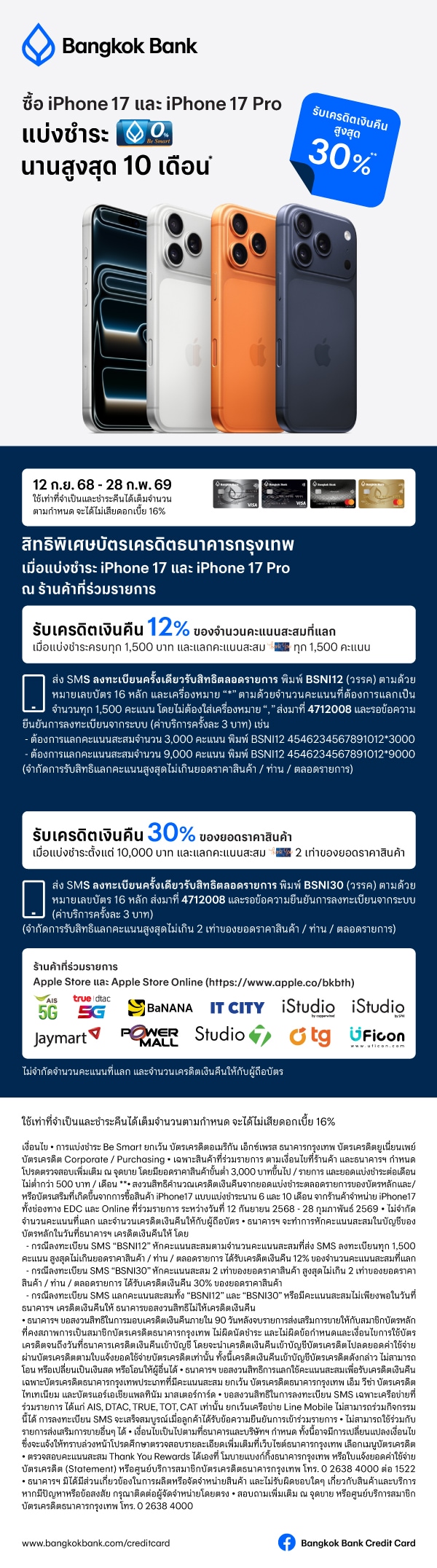 สิทธิพิเศษสำหรับผู้ถือบัตรเครดิตธนาคารกรุงเทพเมื่อซื้อ iPhone 17 ณ ร้านค้าที่ร่วมรายการ รับข้อเสนอพิเศษกับโปรแกรมแบ่งชำระ Be Smart 0% นาน 6 และ 10 เดือน พร้อมรับเครดิตเงินคืนสูงสุด 30%