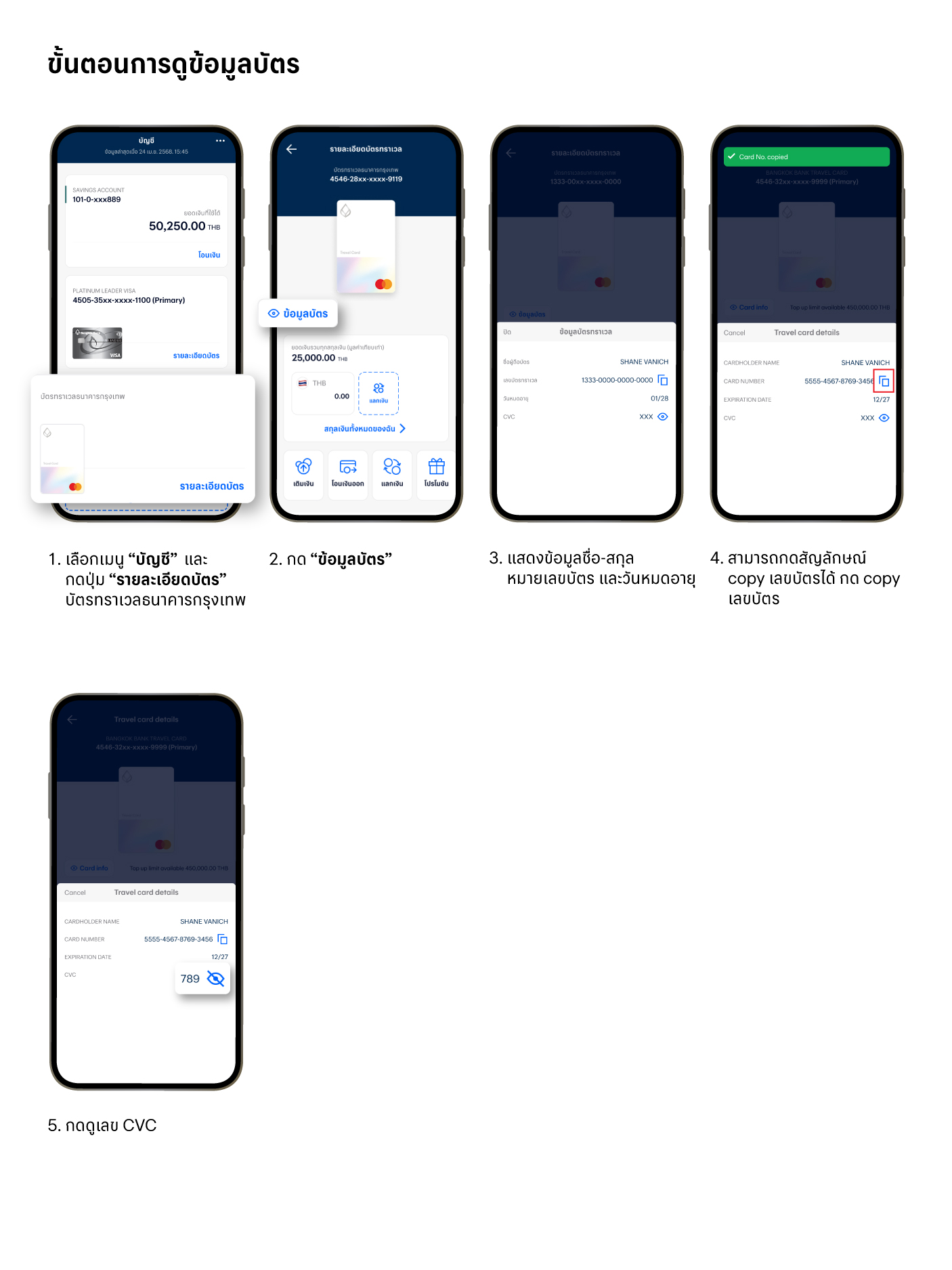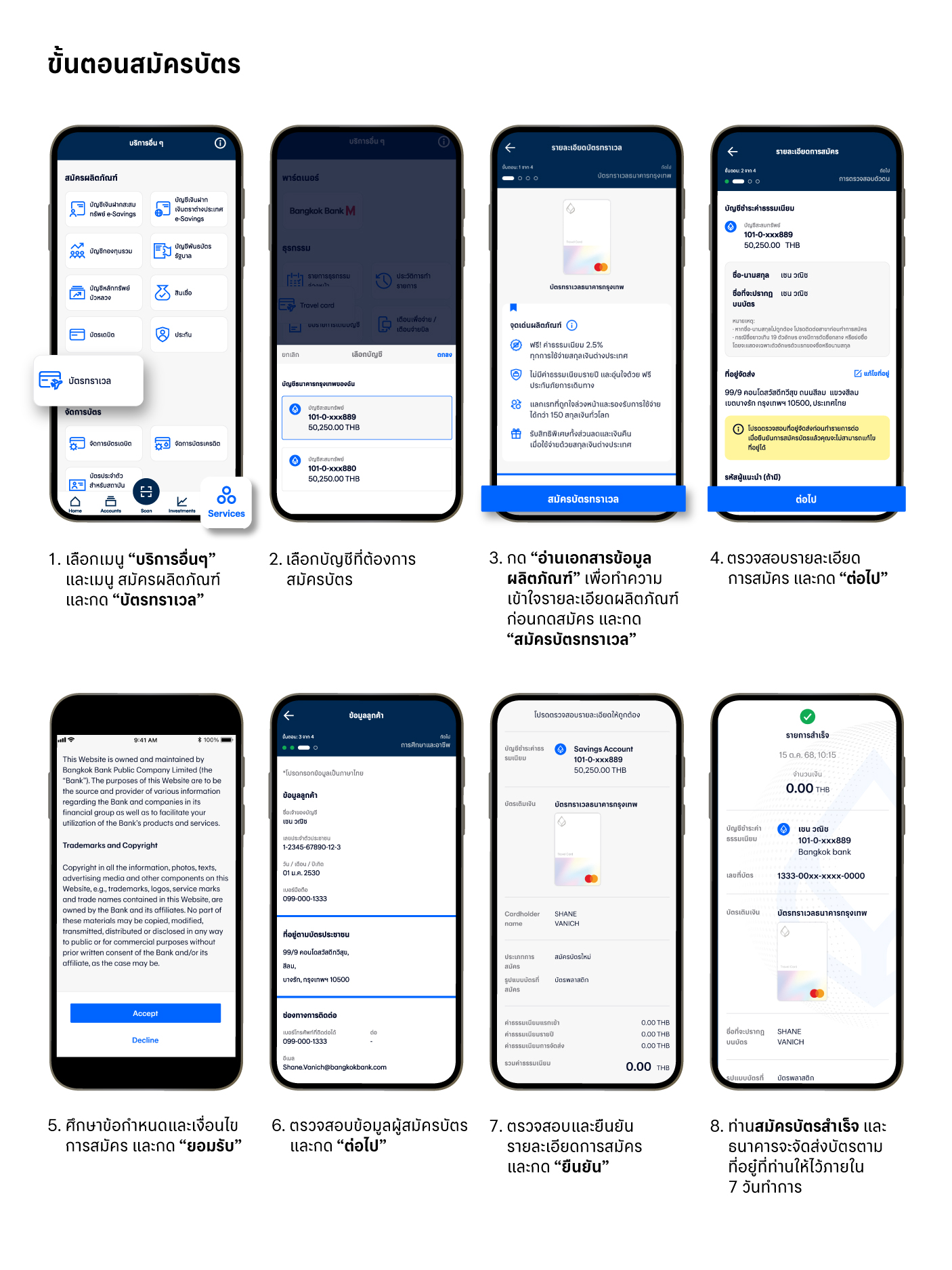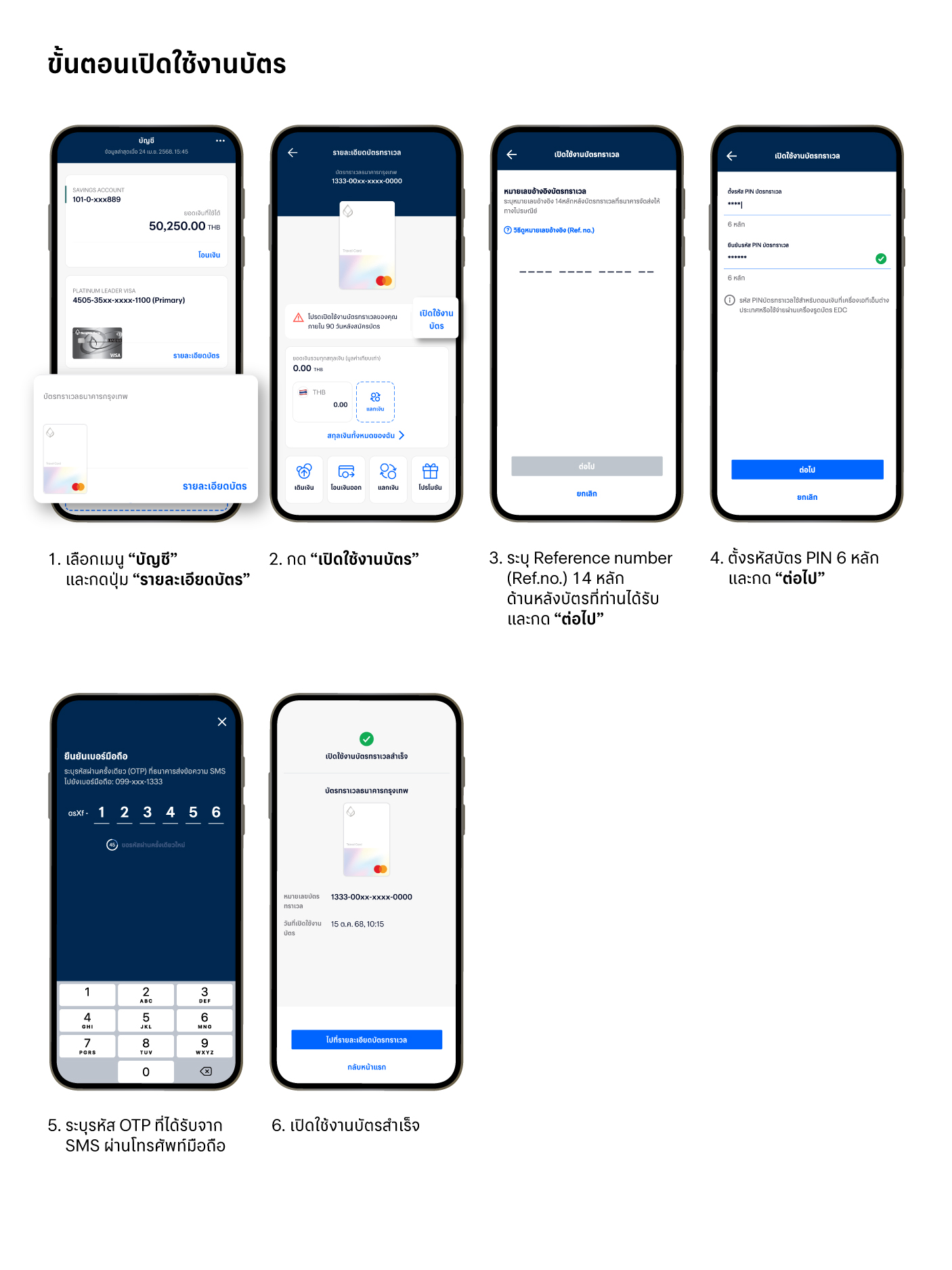 บัตรจะถูกจัดส่งไปยังที่อยู่ของลูกค้าตามที่แจ้งไว้กับธนาคารในขั้นตอนสมัครบัตร ภายใน 7 วันทำการ ทั้งนี้ ระยะเวลาการจัดส่งอาจมีการเปลี่ยนแปลงขึ้นอยู่กับที่อยู่ของลูกค้าและการจัดส่งของผู้ให้บริการภายนอกด้วย