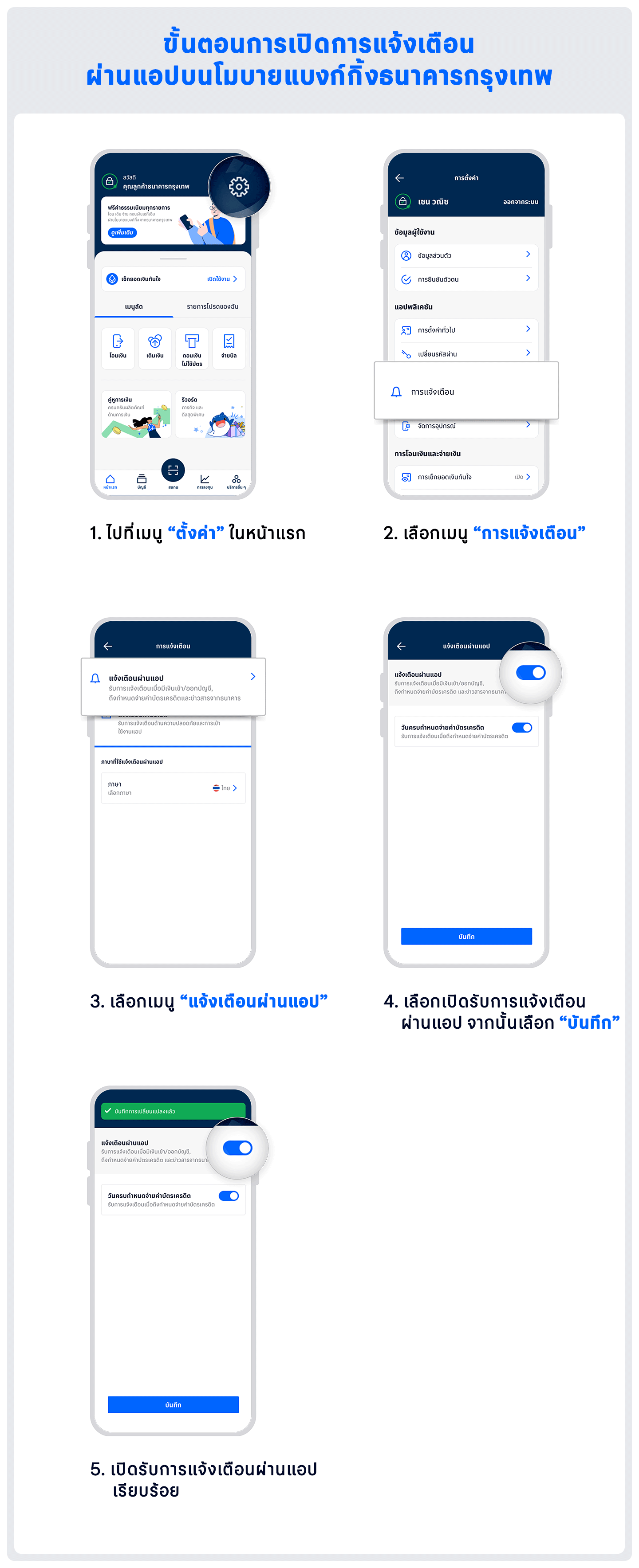 รู้ความเคลื่อนไหวของบัญชี ตั้งค่าการแจ้งเตือนโอนเงินออก รวมถึงแจ้งเตือนโปรโมชันและบริการดี ๆ จากธนาคารกรุงเทพฟรี เด้งบอกทันที ผ่านแอปโมบายแบงก์กิ้งธนาคารกรุงเทพ