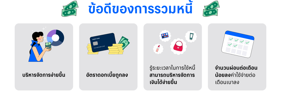 ถือเป็นอีกวิธี ที่ทำให้ช่วยลดภาระหนี้ ซึ่งการรวมหนี้นั้น คือการที่เรานำหนี้ดอกเบี้ยสูง ซึ่งเราอาจจะต้องจ่าย มากมายหลายที่ เกิดภาวะหมุนเวียนเงินไม่ทัน เช่น หนี้บัตรเครดิต หรืออาจจะเป็นหนี้สินเชื่อรายย่อยประเภทอื่น ที่เราอาจเคยไปกู้ยืมมาใช้จ่าย มารวมไว้ที่เดียวกัน ซึ่งจะส่งผลให้เราบริหารจัดการค่าใช้จ่ายได้ง่าย รวมมาไว้ที่เดียว แถมช่วยลดภาระดอกเบี้ยและส่งผลให้เราปิดหนี้ได้เร็วยิ่งขึ้น ทั้งนี้ผู้ที่ทำการปิดหนี้หรือรวมหนี้แล้วต้องมีวินัยในการบริหารจัดการเงินด้วย เพื่อไม่ให้เกิดวงจรกู้ยืมจนเกิดดอกเบี้ยจนเป็นหนี้แบบชักหน้าไม่ถึงหลังซ้ำอีก