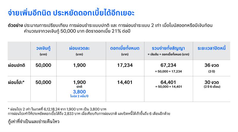 นอกจากการนำเงินโบนัสไปลงทุนและเก็บออม หากคุณแบ่งโบนัสที่ได้รับไปชำระหนี้เพิ่ม จะทำให้เงินต้นลดลงเร็วขึ้น และลดดอกเบี้ยรวมตลอดอายุสัญญาลงได้