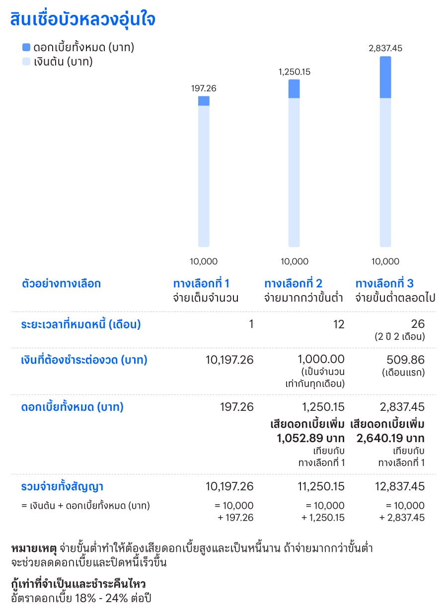 รู้หรือไม่ ? "จ่ายเพิ่มอีกนิด ประหยัดดอกเบี้ยได้อีกเยอะ" การเลือกชำระคืนขั้นต่ำอย่างต่อเนื่อง จะส่งผลให้ต้องชำระดอกเบี้ยรวมตลอดสัญญาในจำนวนที่สูง และใช้ระยะเวลานานในการชำระคืนหนี้ทั้งหมด แต่หากเลือกชำระแบบเต็มจำนวนจะช่วยลดดอกเบี้ยตลอดสัญญาได้มากกว่า
