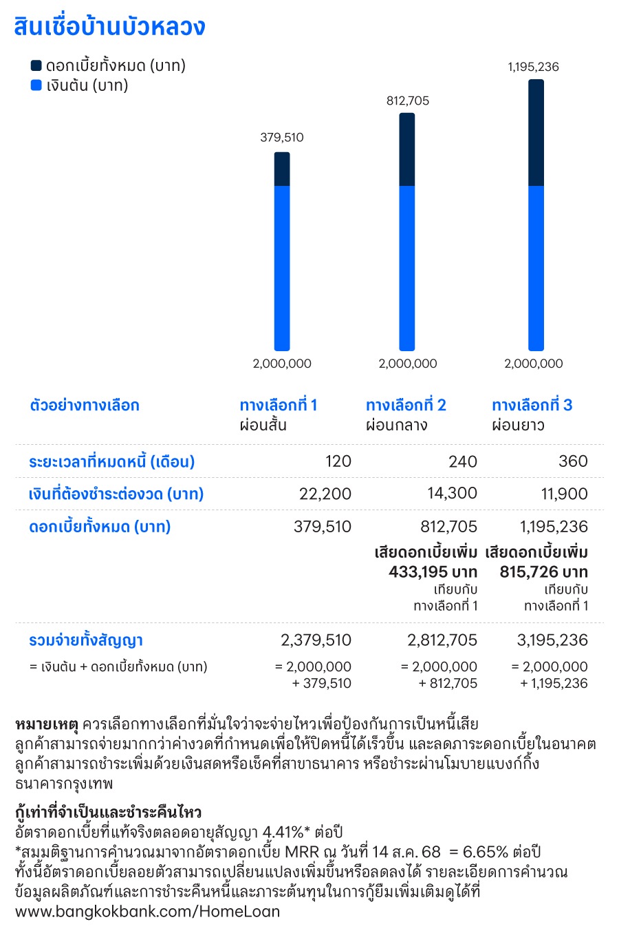 คำนวณจาก วงเงินกู้ 2,000,000 บาท อัตราดอกเบี้ย ปีที่ 1 เท่ากับ 2.75% ปีที่ 2 – 3 เท่ากับ MRR-3.30% (=3.35%) หลังจากนั้น ตั้งแต่ปีที่ 4 เป็นต้นไป เท่ากับ MRR-1.50% (=5.15%) ผ่อนชำระแบบคงที่